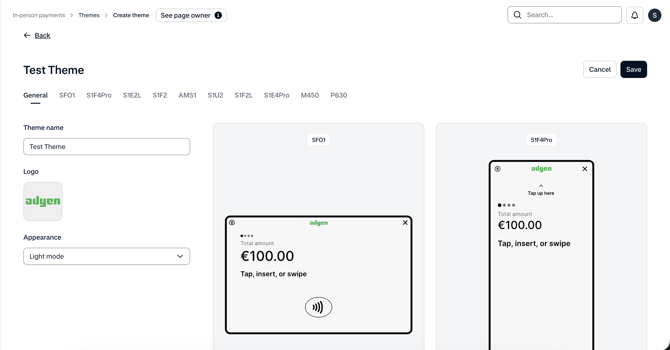 Themes can only be created on company or merchant level but can be applied to store and terminal level as well.Â